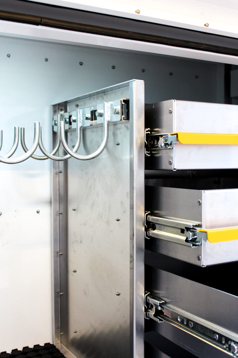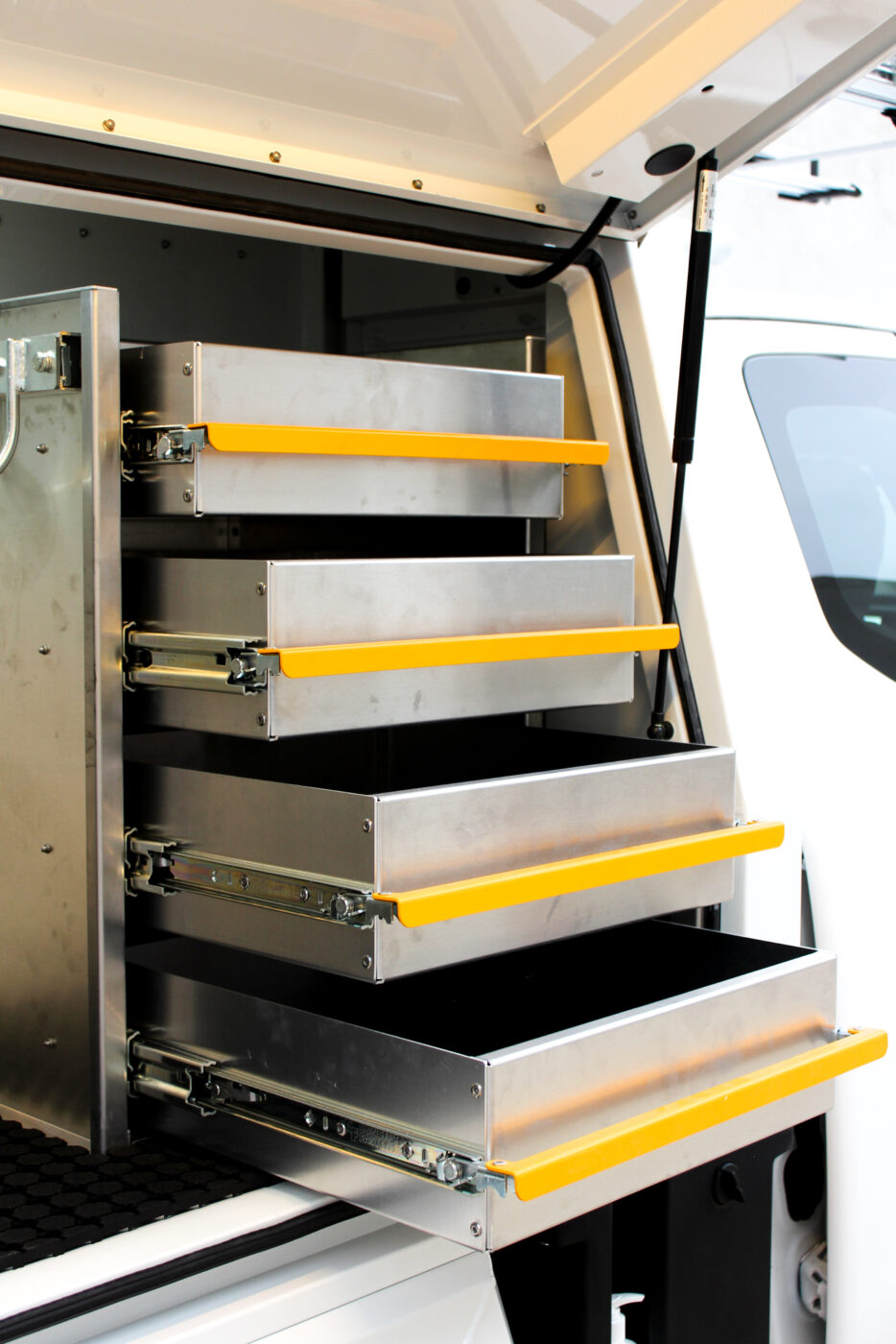 • Underbody drawer, tapered underbody boxes, Client-specific shelving, custom four-drawer cargo swift units, and conduit carriers for secure and efficient equipment handling.