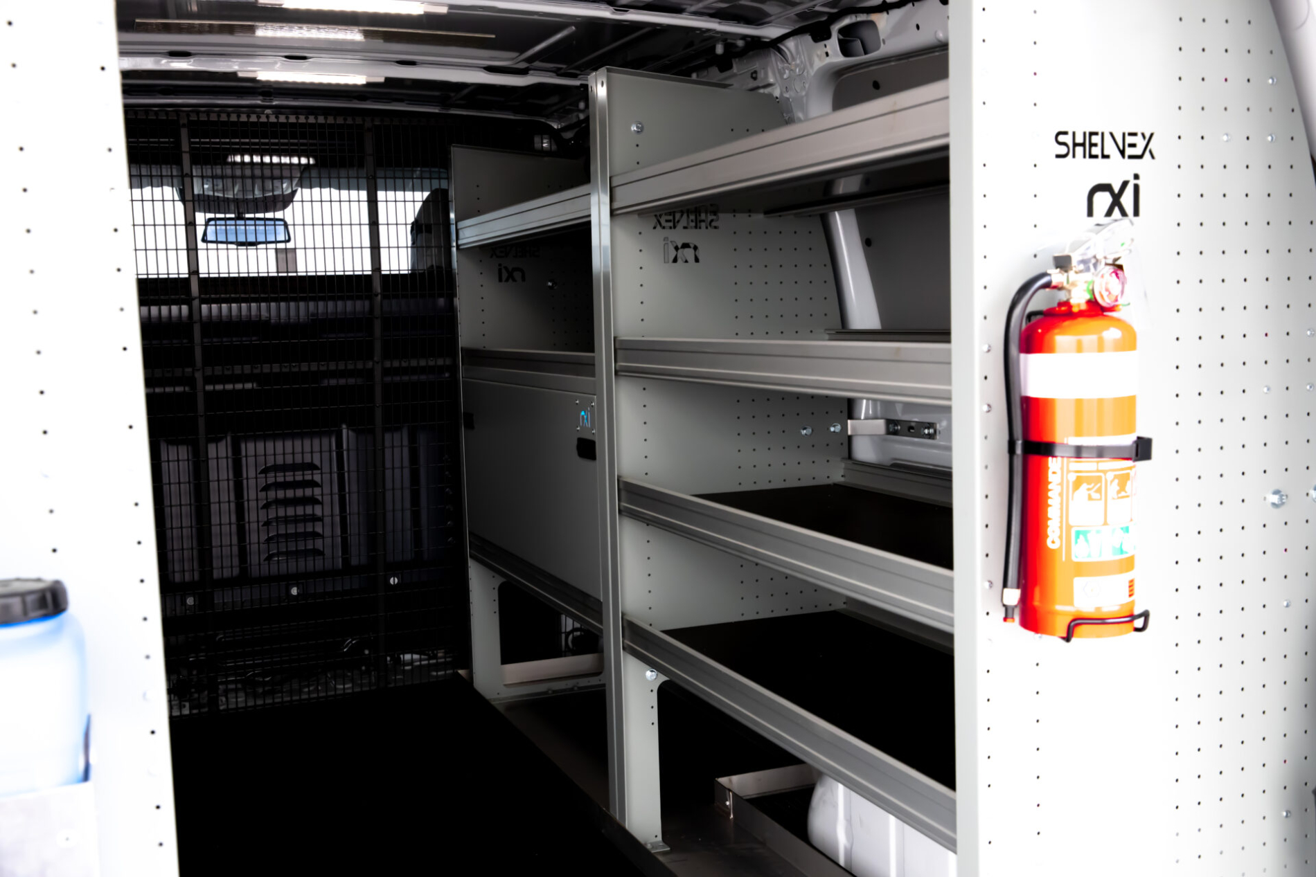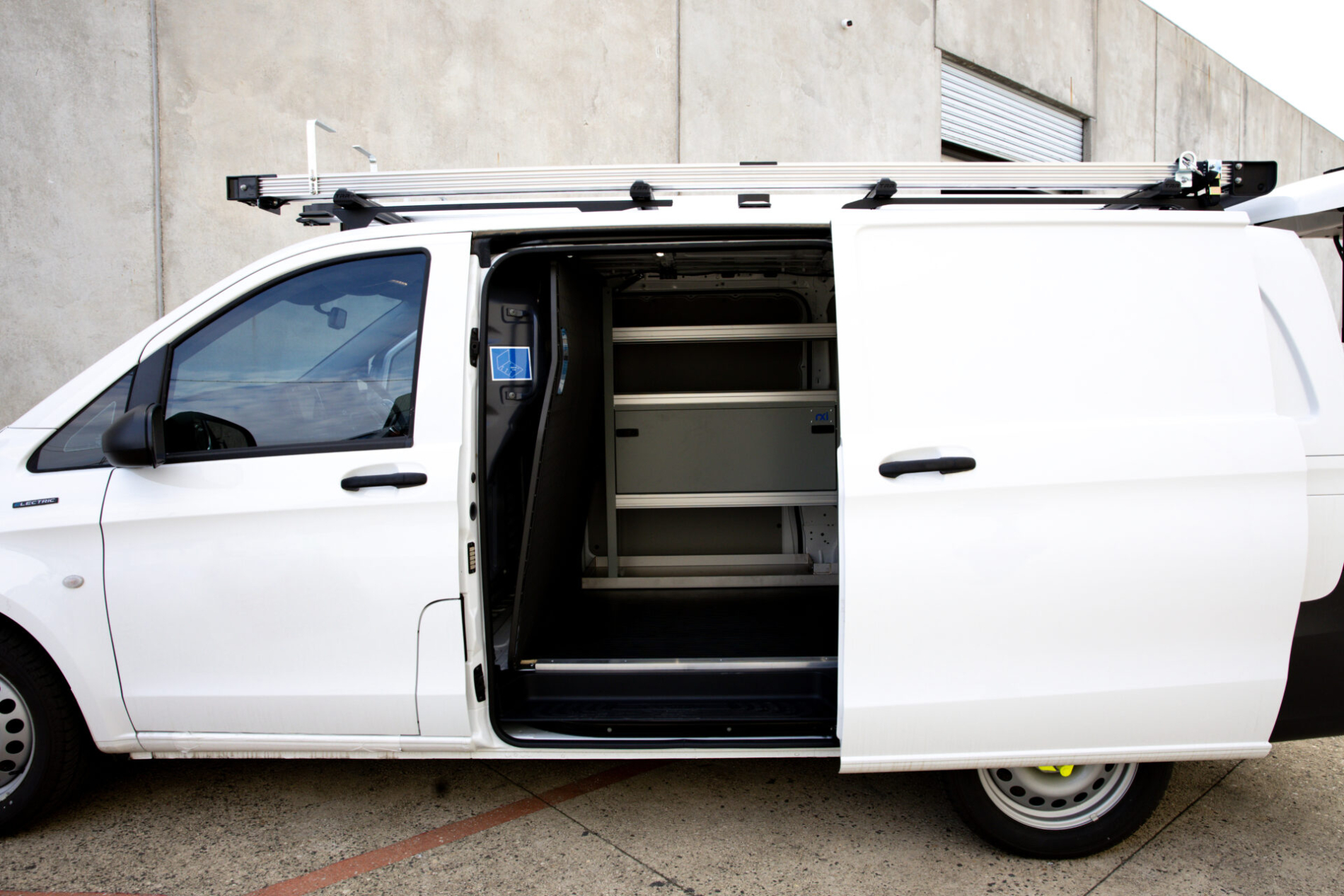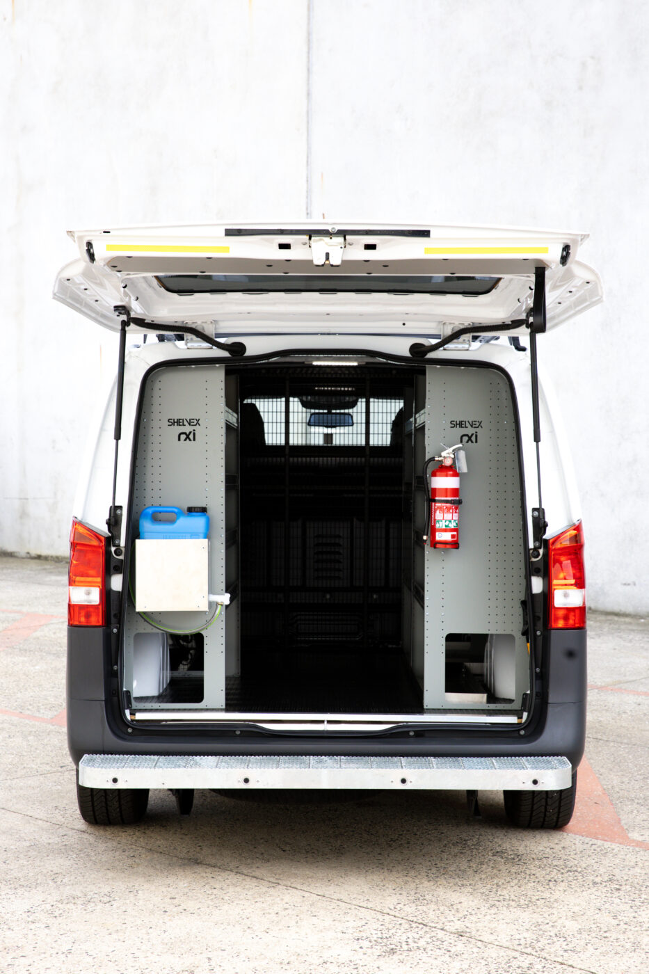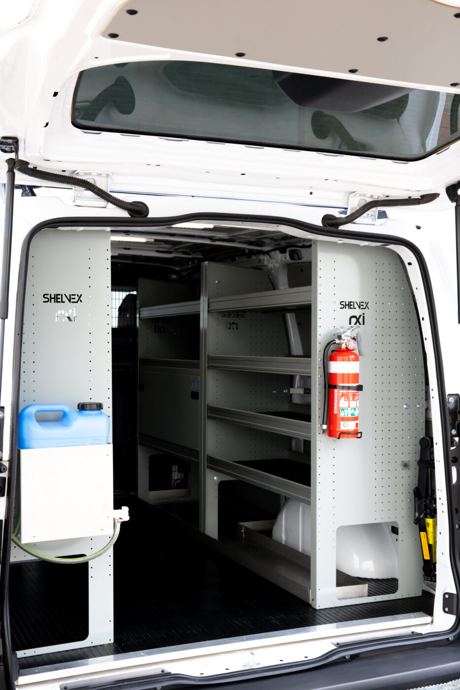 - The fitout included multiple custom Shelvex storage bays with a mix of lockable shelves and panelled shelving systems, optimised for efficient tool and part storage in a compact electric van layout.