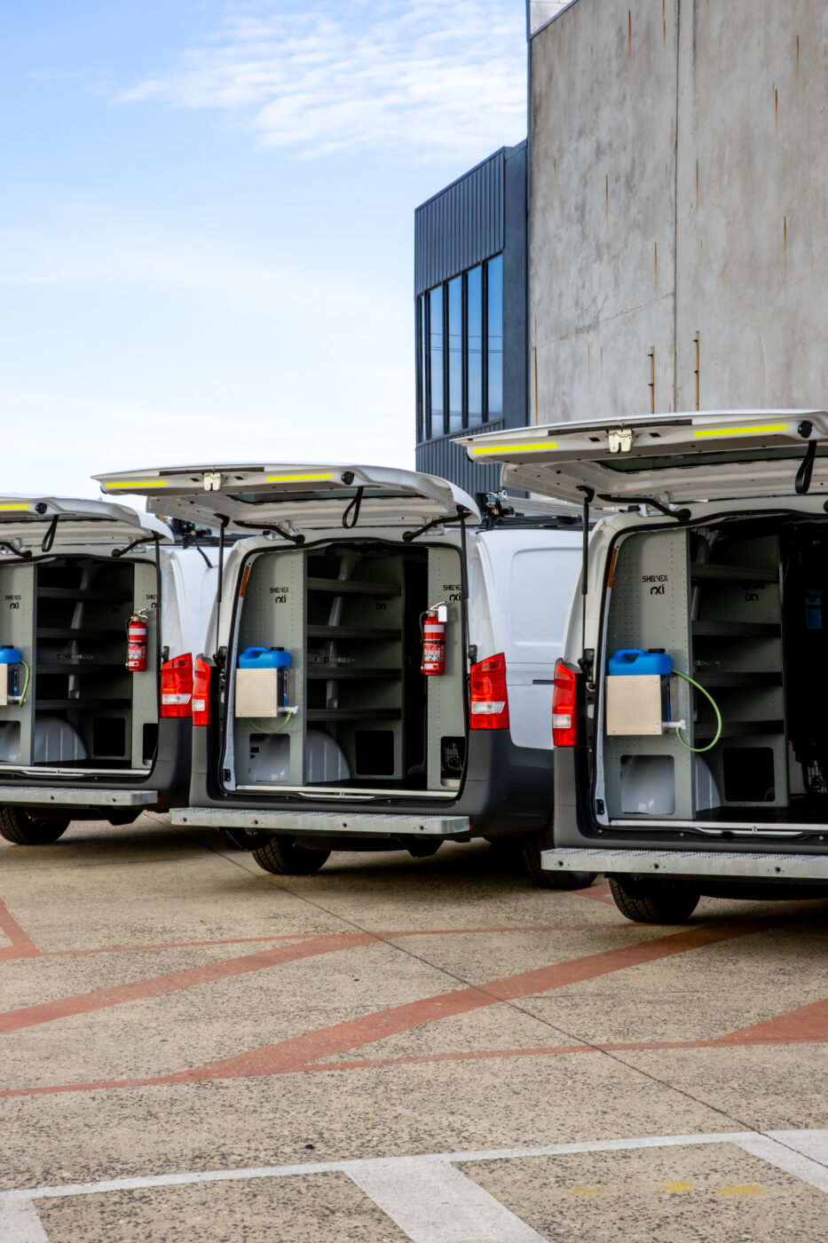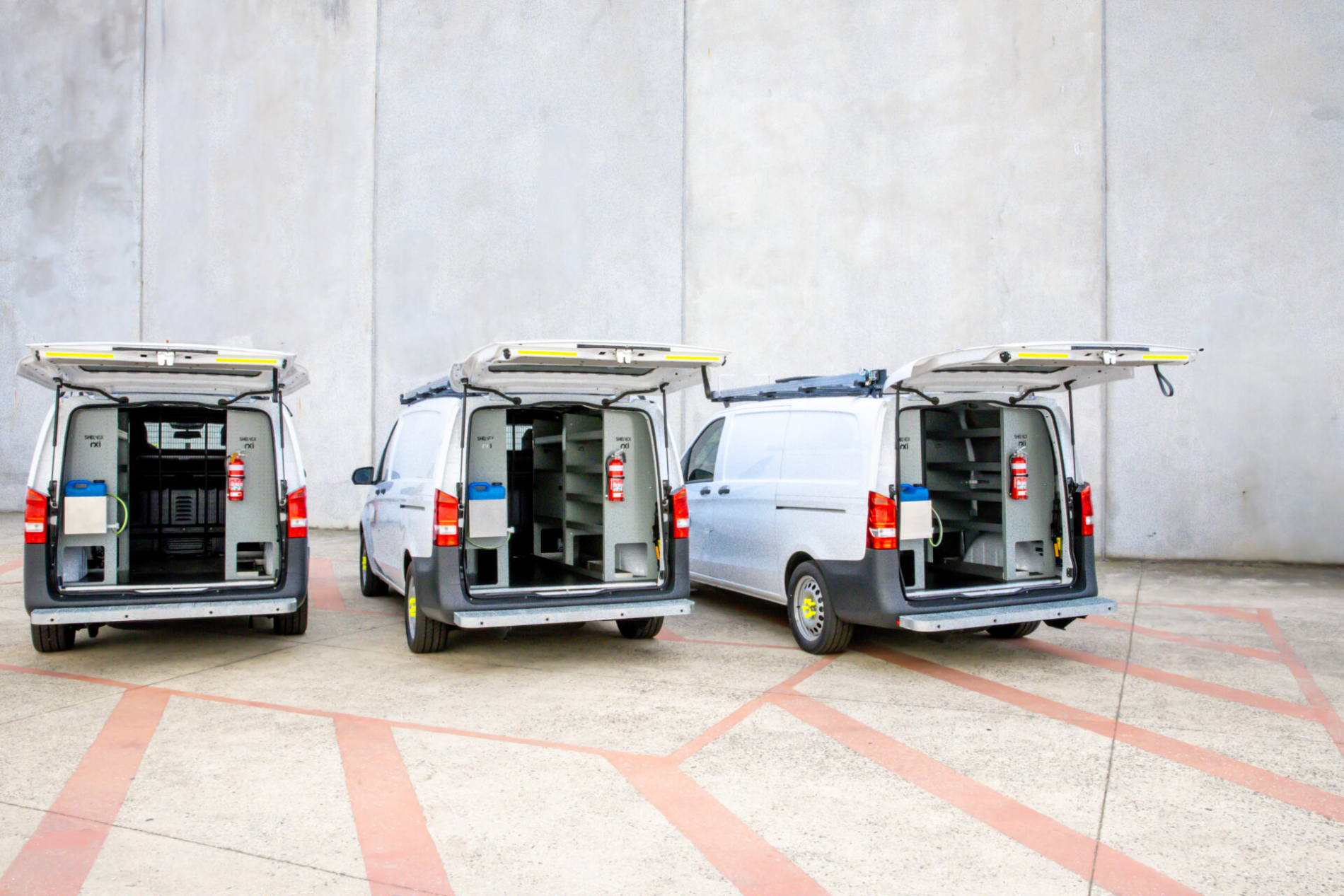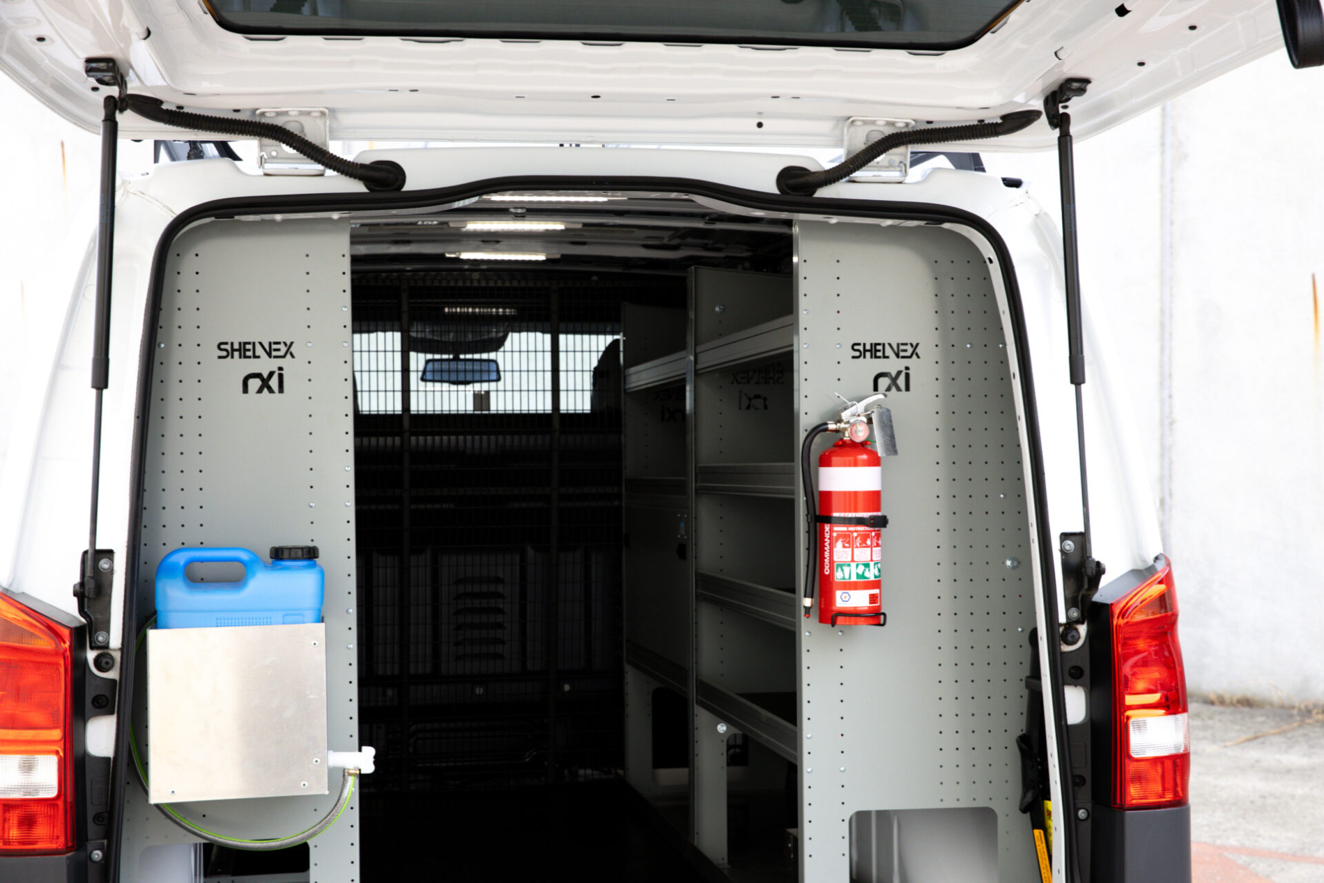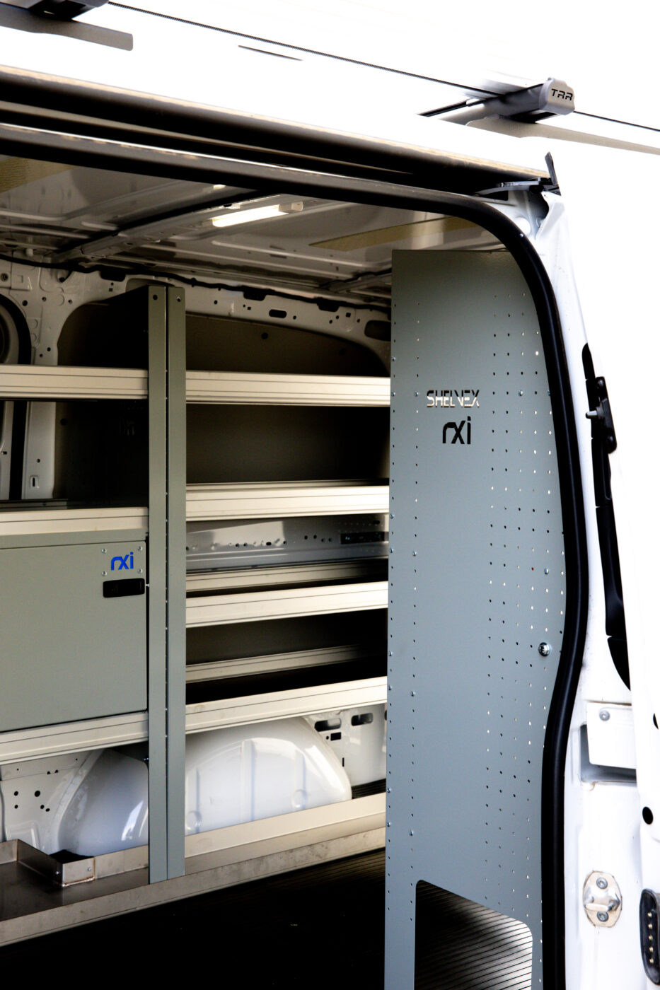 - The fitout included multiple custom Shelvex storage bays with a mix of lockable shelves and panelled shelving systems, optimised for efficient tool and part storage in a compact electric van layout.