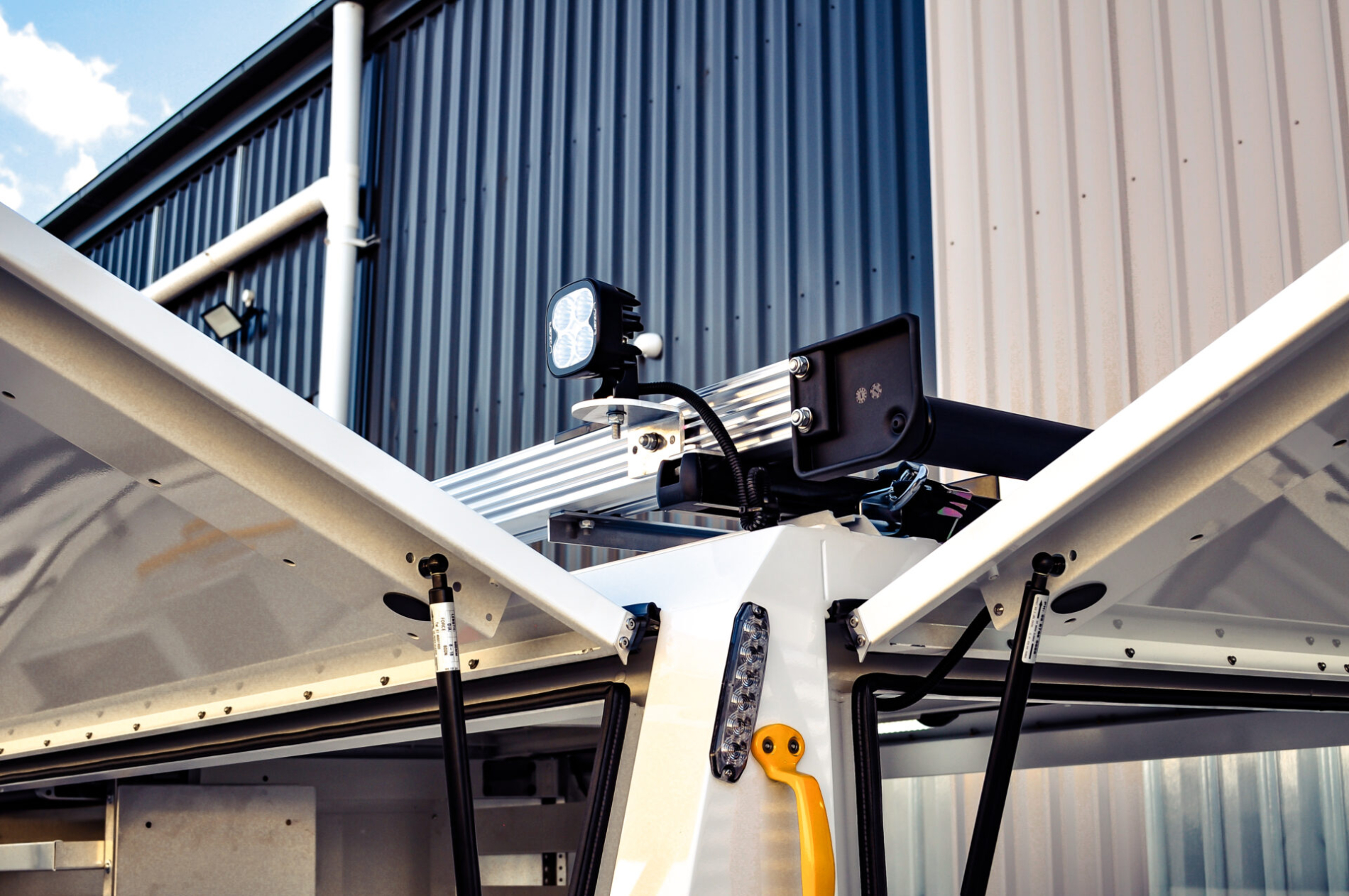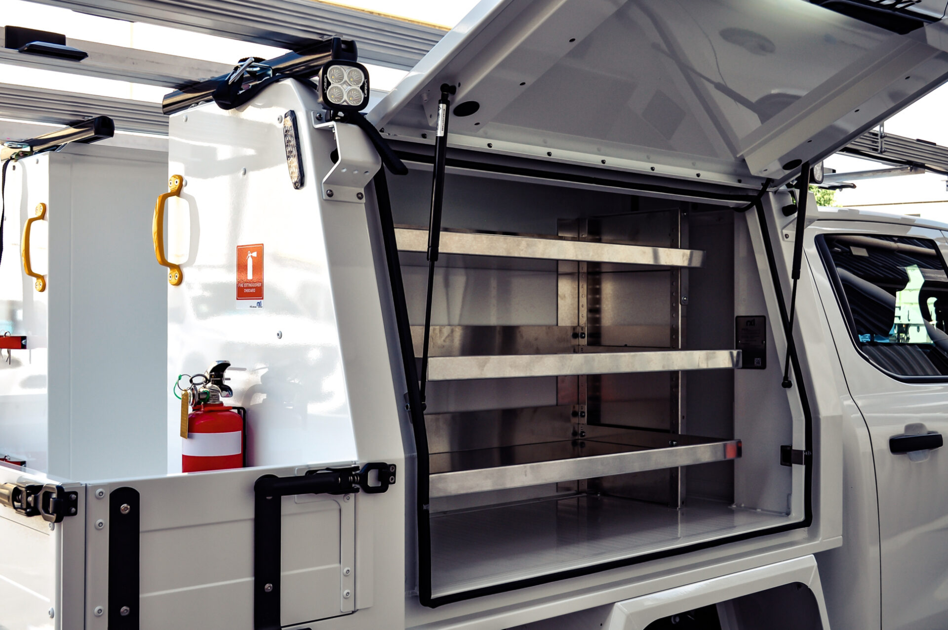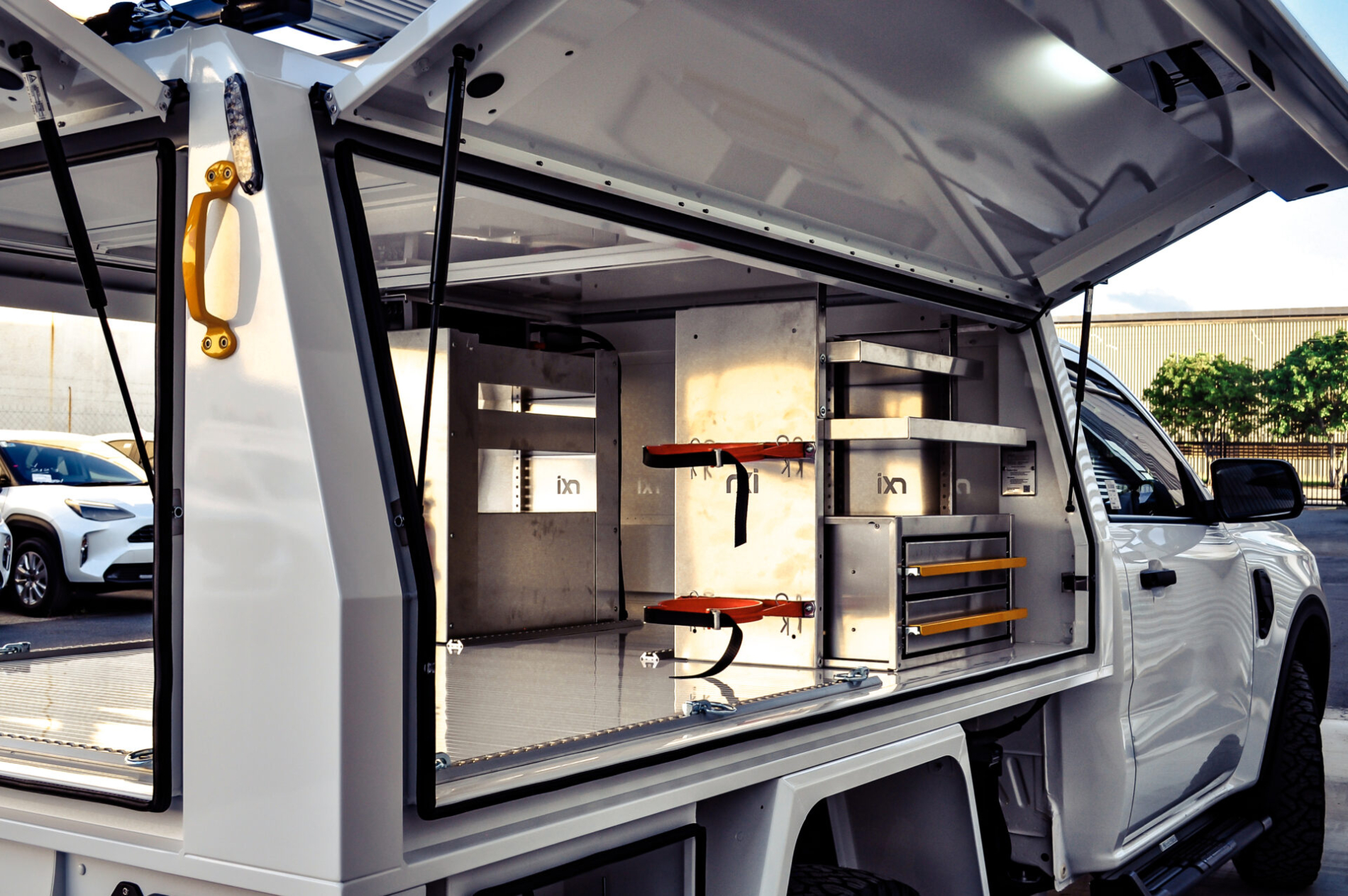 • Full aluminium Canopex service body (2400L x 1850W x 900H) with powered gullwing side doors and powered rear door. Integrated shelving, Cargoswift drawers, and bottle/cylinder holder provide organised storage with secure access.