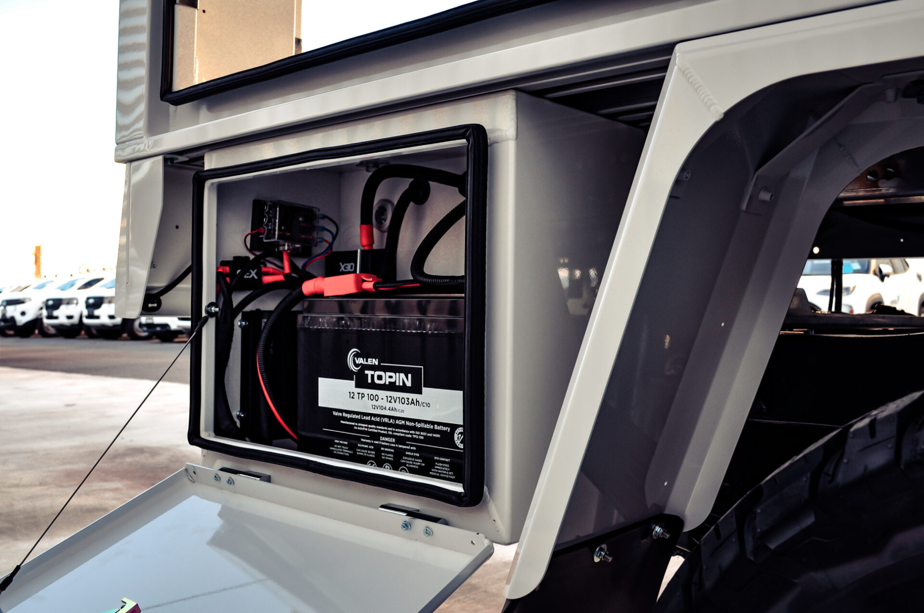 • 2000W Projecta pure sine wave inverter (roof mounted), dual battery system, LED interior and external lighting, flush-mount reverse lights, swivel lights, E-Pac central locking system, and 3000-lumen work lights.