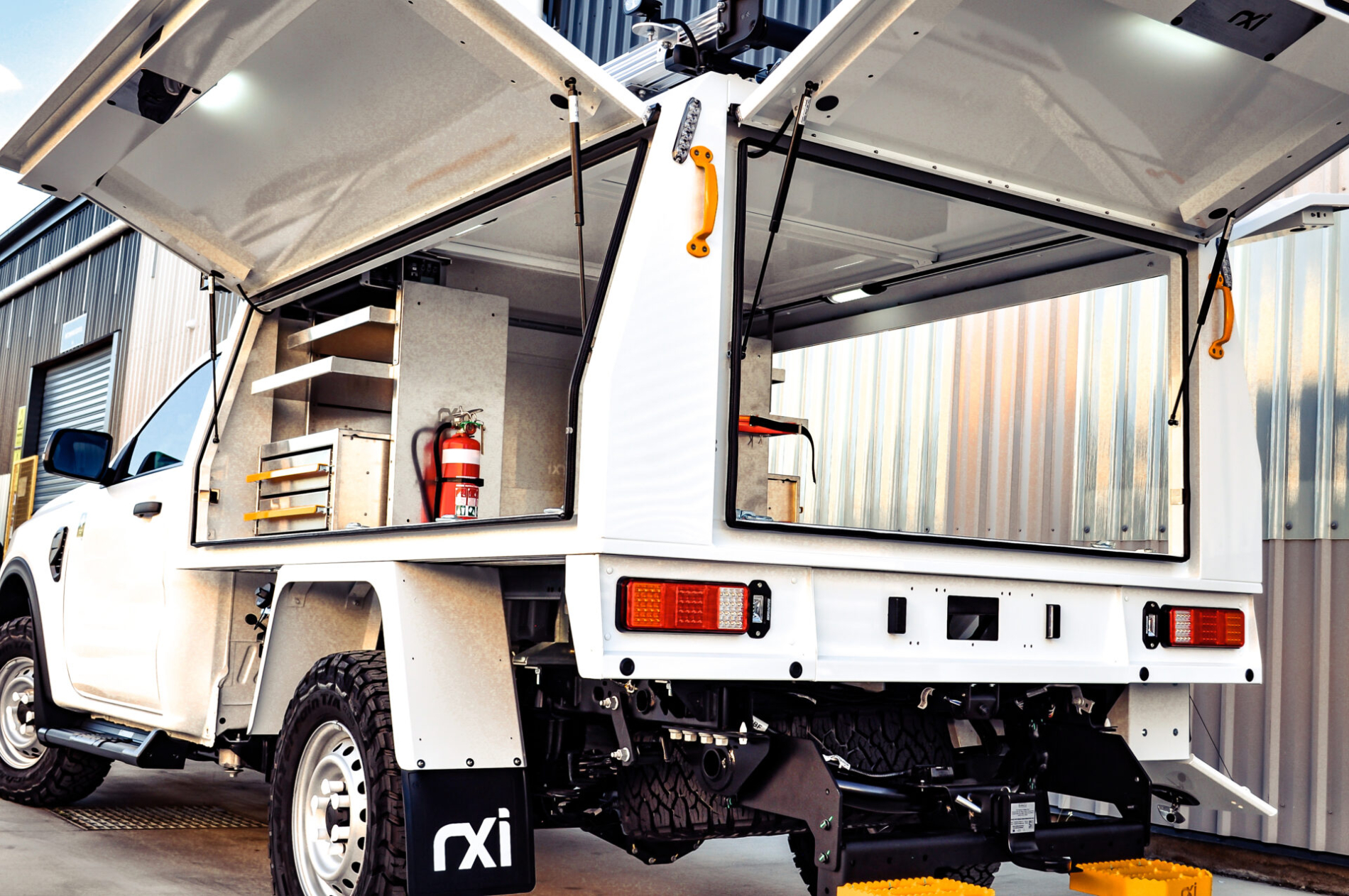 RXI delivered a fully equipped Ford Ranger Single Cab build for a company’s Unify QLD program. This fitout features a full Canopex aluminium body with powered access, integrated shelving and drawers, and a 2000W inverter for on-site capability. The vehicle includes critical safety gear, EROAD fleet monitoring, smart lighting, and durable protection. With tie-down systems and roof-mounted ladder handling, this build is a complete mobile solution for field infrastructure work.