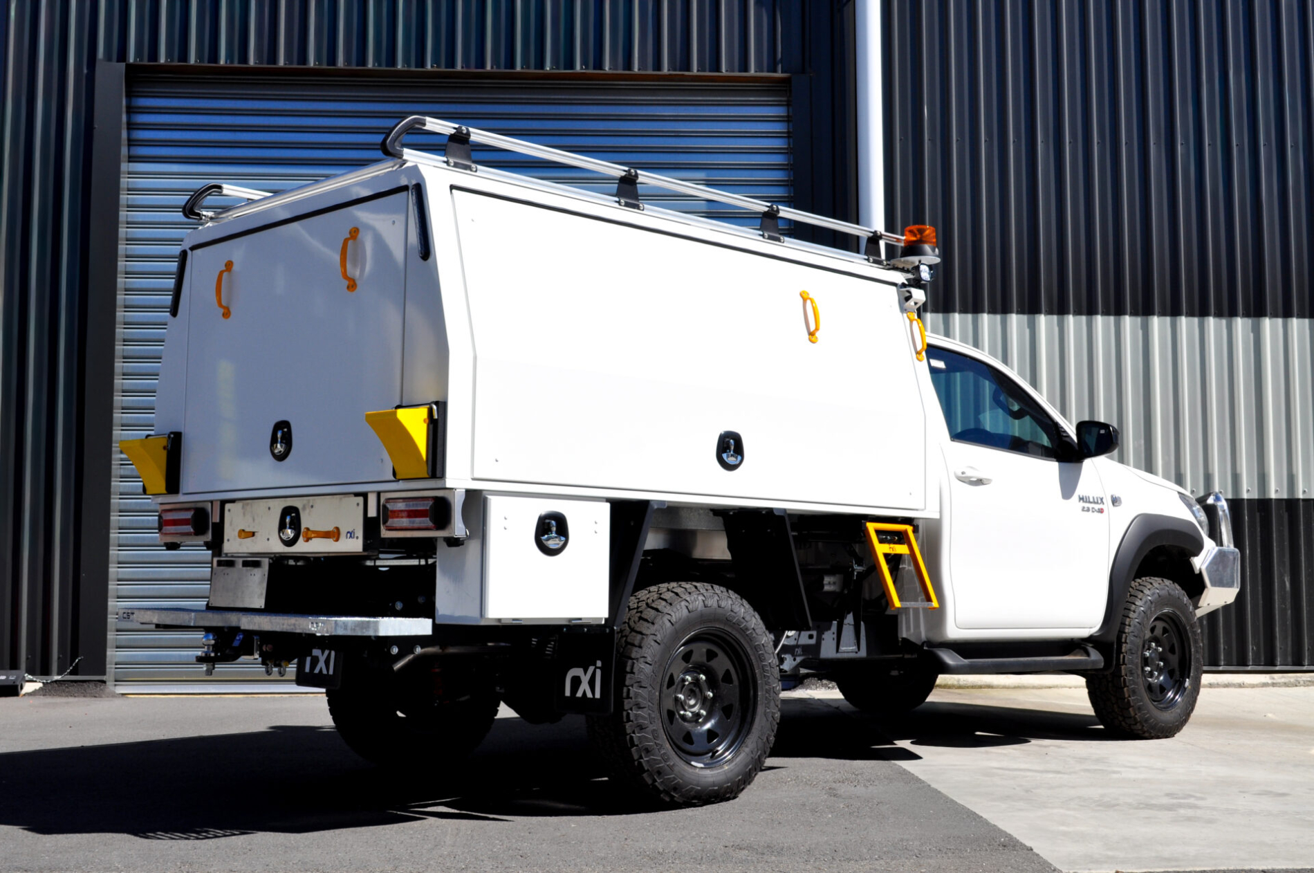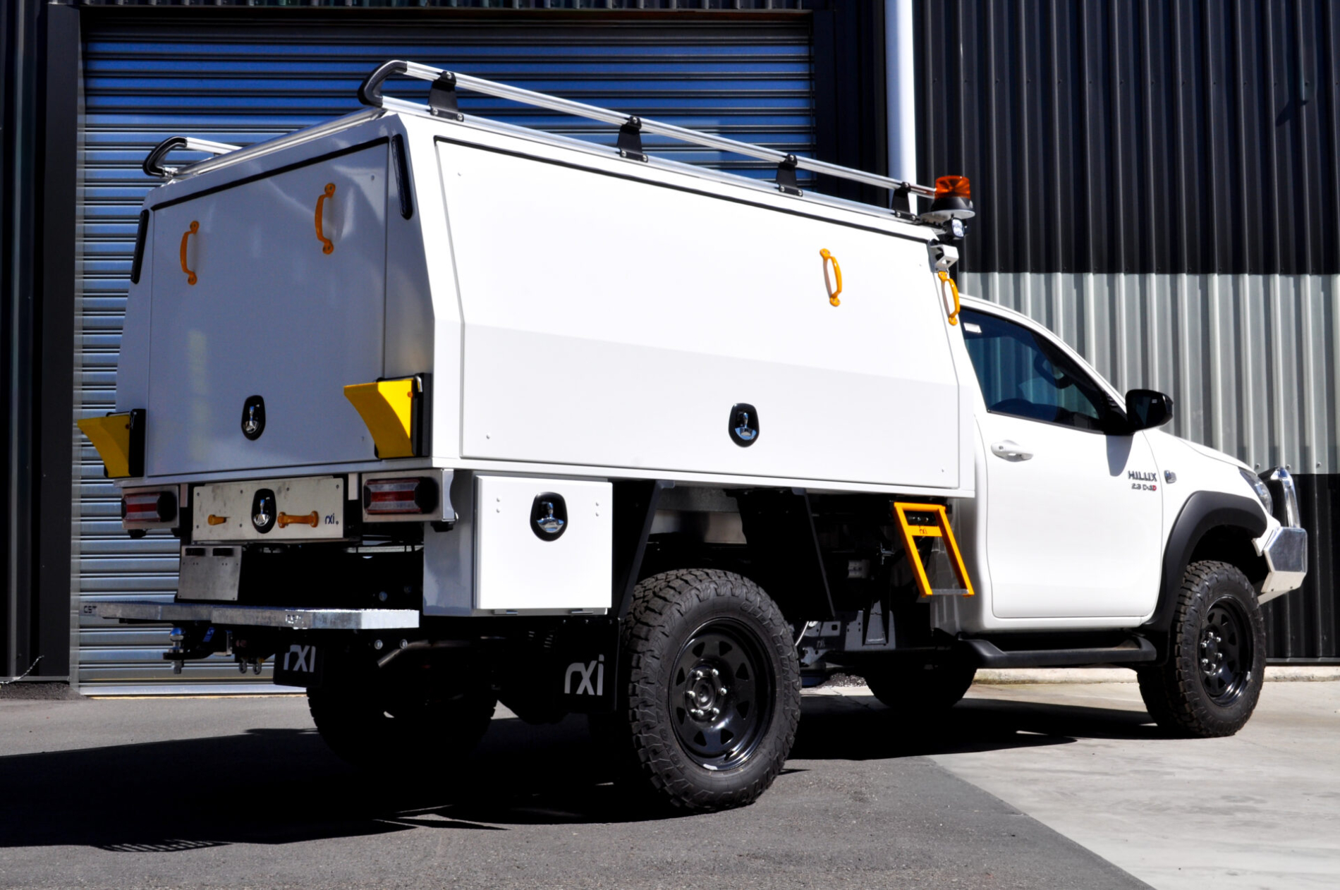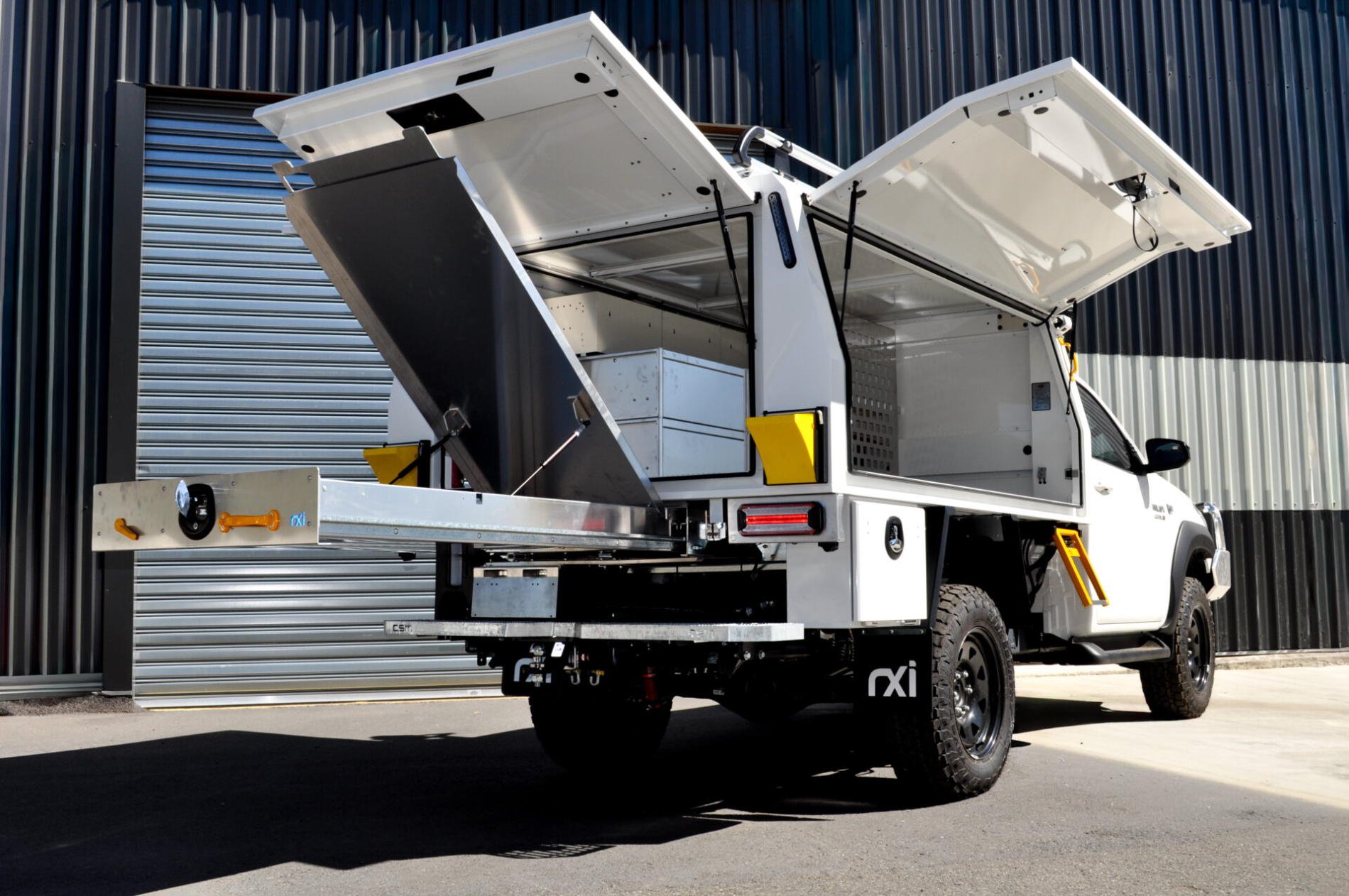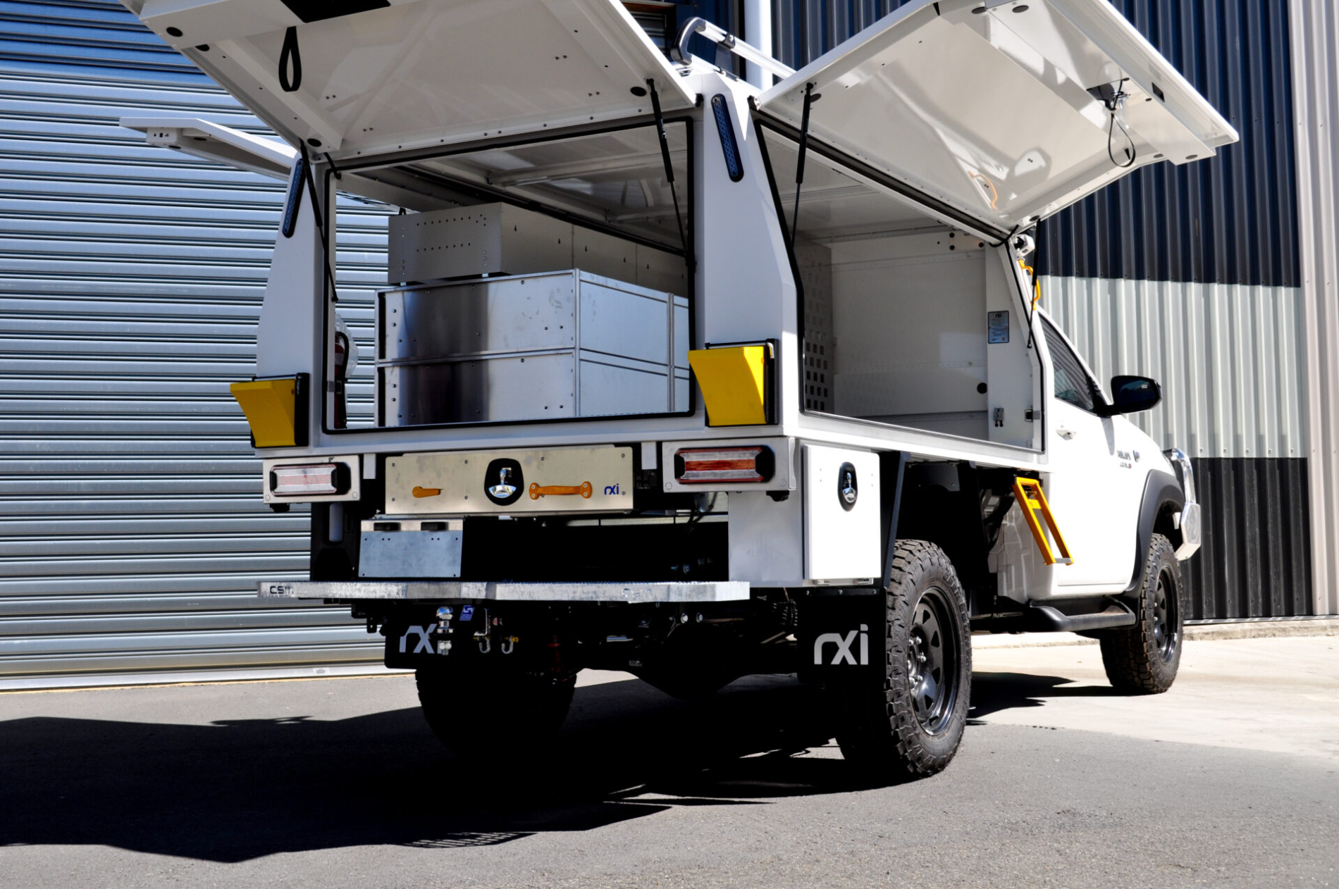 • Canopex full body 3-door aluminium service body (2400L x 1850W x 1000H) with powered gullwing side doors, powered rear door, compliant mounting kit, and colour-matched 2Pak paint finish.