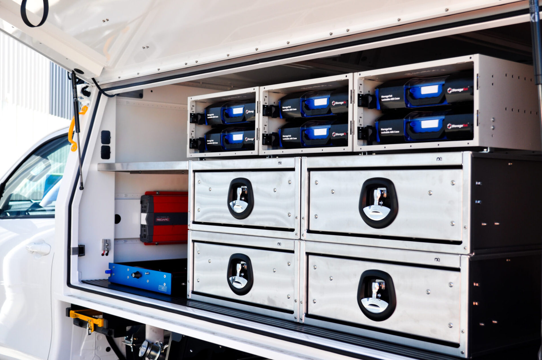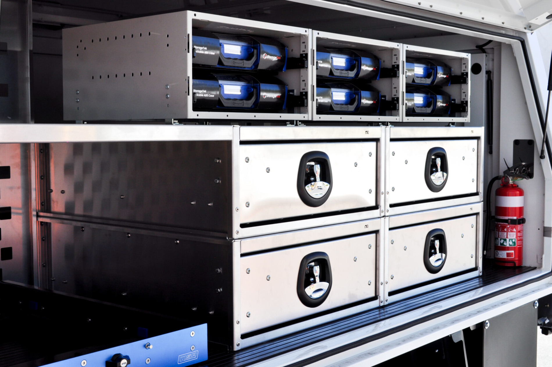 • Storage solutions included a 2200L underbody drawer with staged locking, four internal aluminium drawer units, false floor above fridge slide, mesh divider, and multiple Storagetek cabinets with removable small cases.