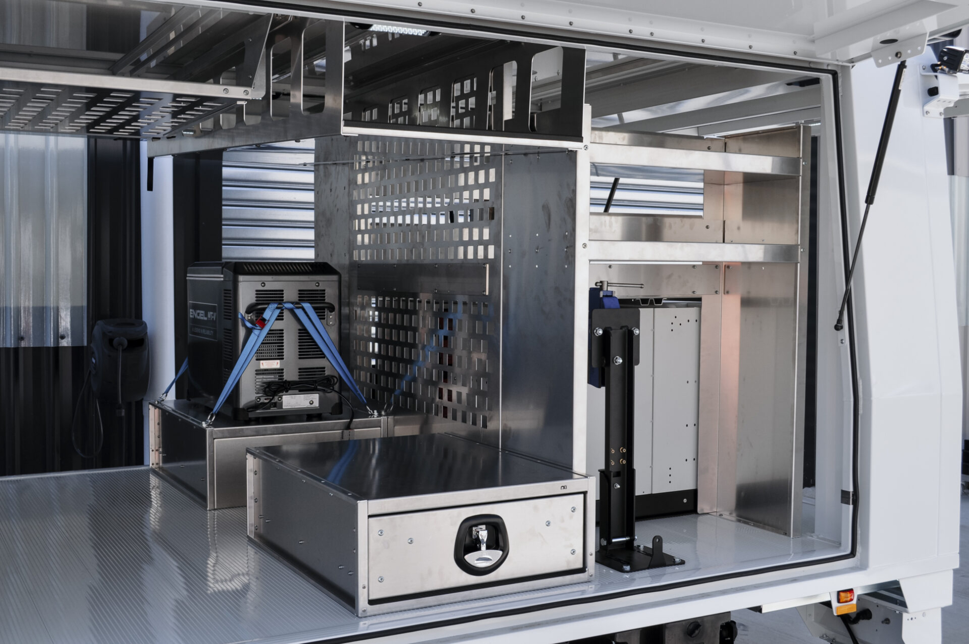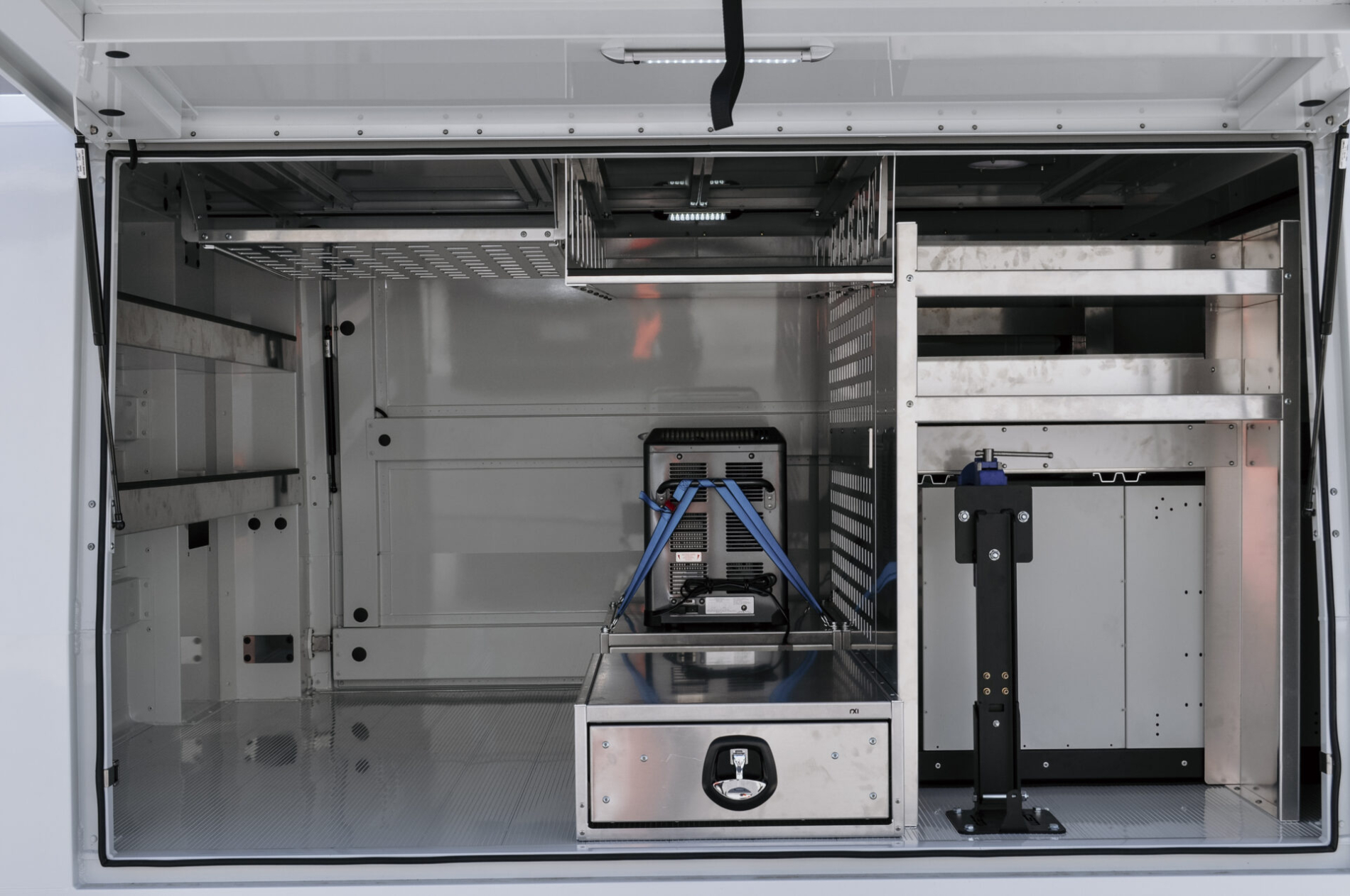 • Built with durable aluminium extrusion and 2.5mm aluminium sheet, the structure is designed for strength, longevity, and lightweight efficiency. Safety additions include a defibrillator mount, pull-out steps, heavy-duty vice, and advanced lighting solutions.