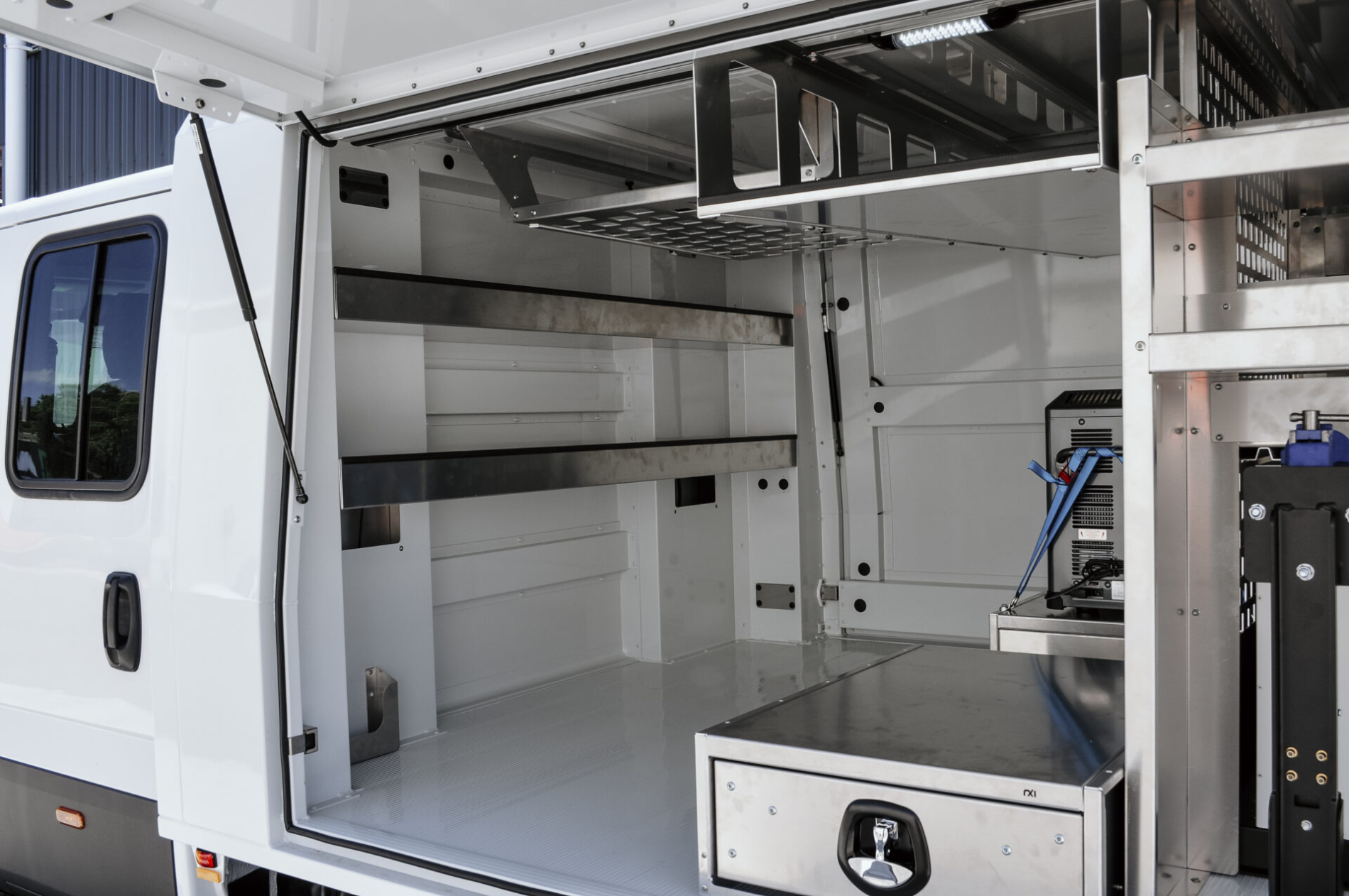 • Service body features internal shelving, sliding platforms, and specialised storage compartments to ensure quick and efficient access to tools and equipment.