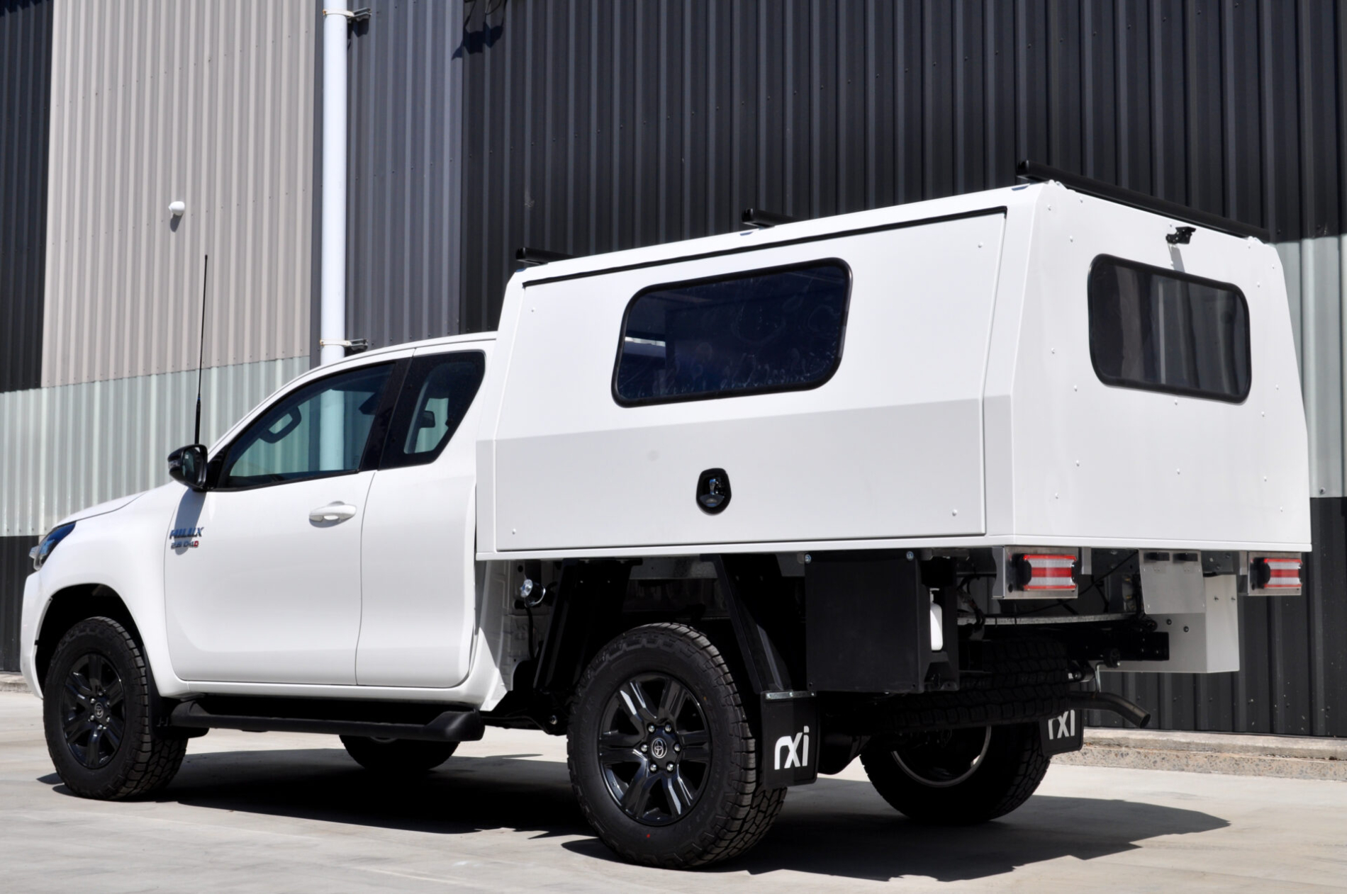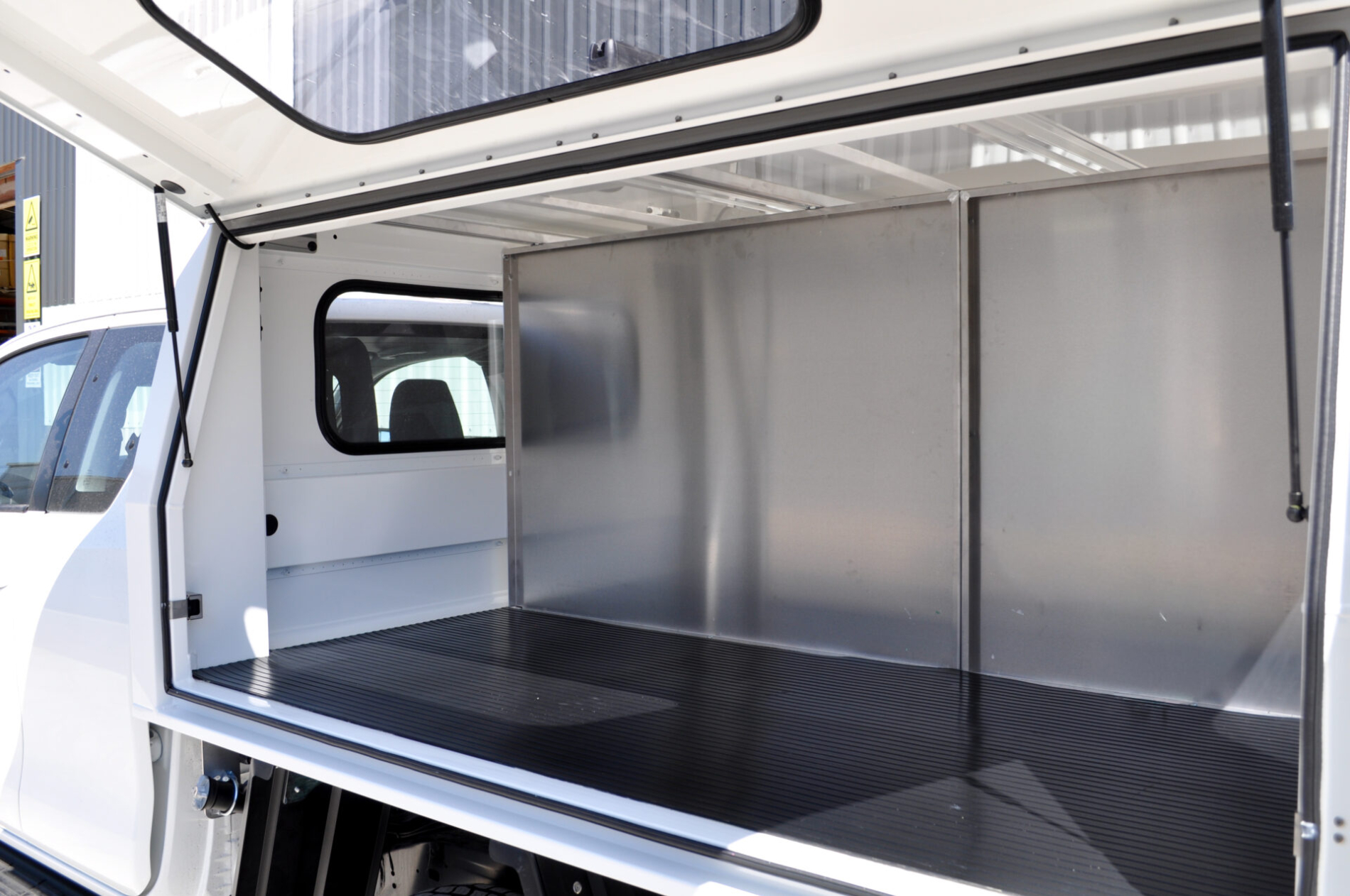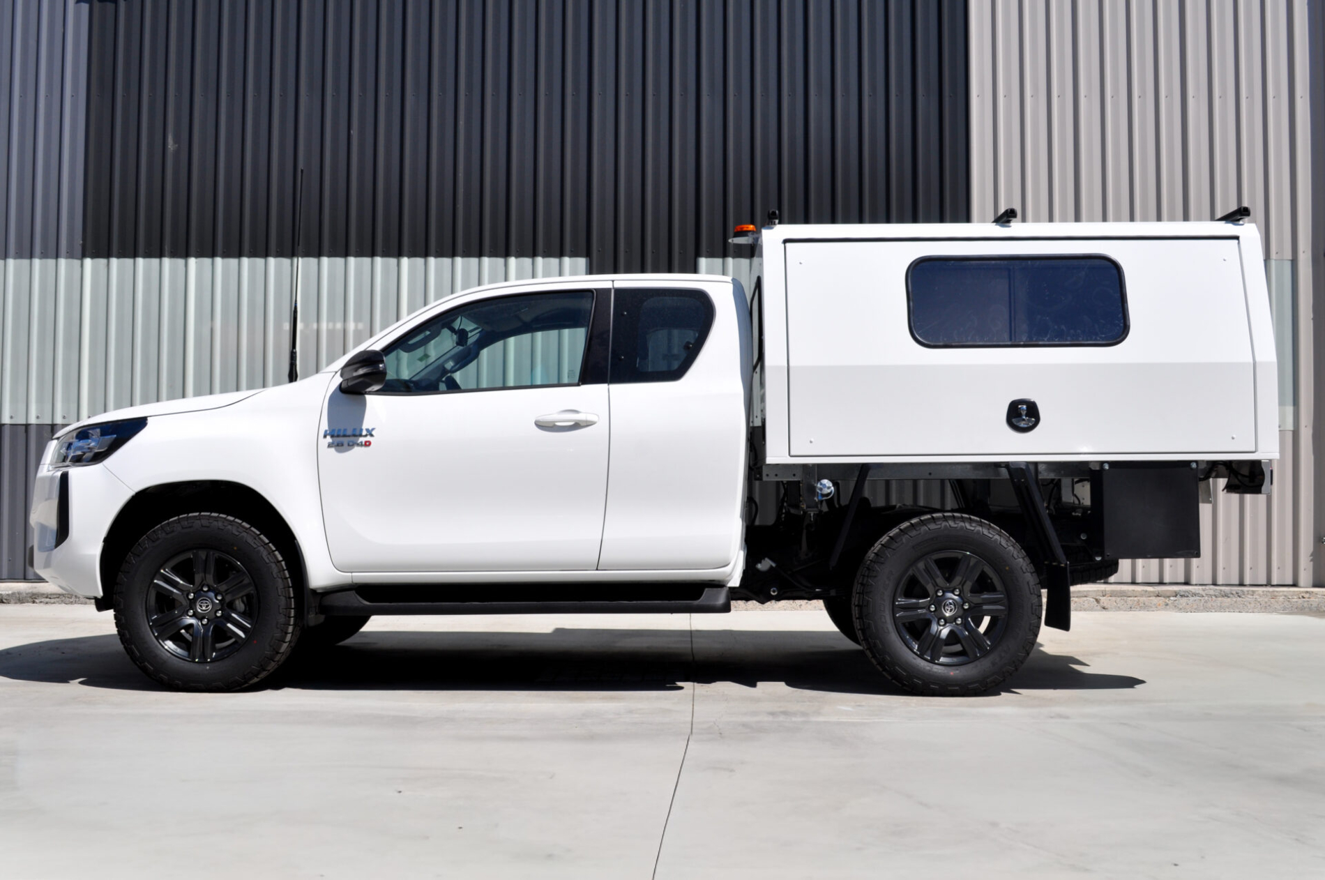 - Canopex full body 2-door aluminium service body (2100L x 1850W x 1000H) with front and rear acrylic windows, powered gullwing side doors, and compliant mounting kit with integrated fuel filler system.