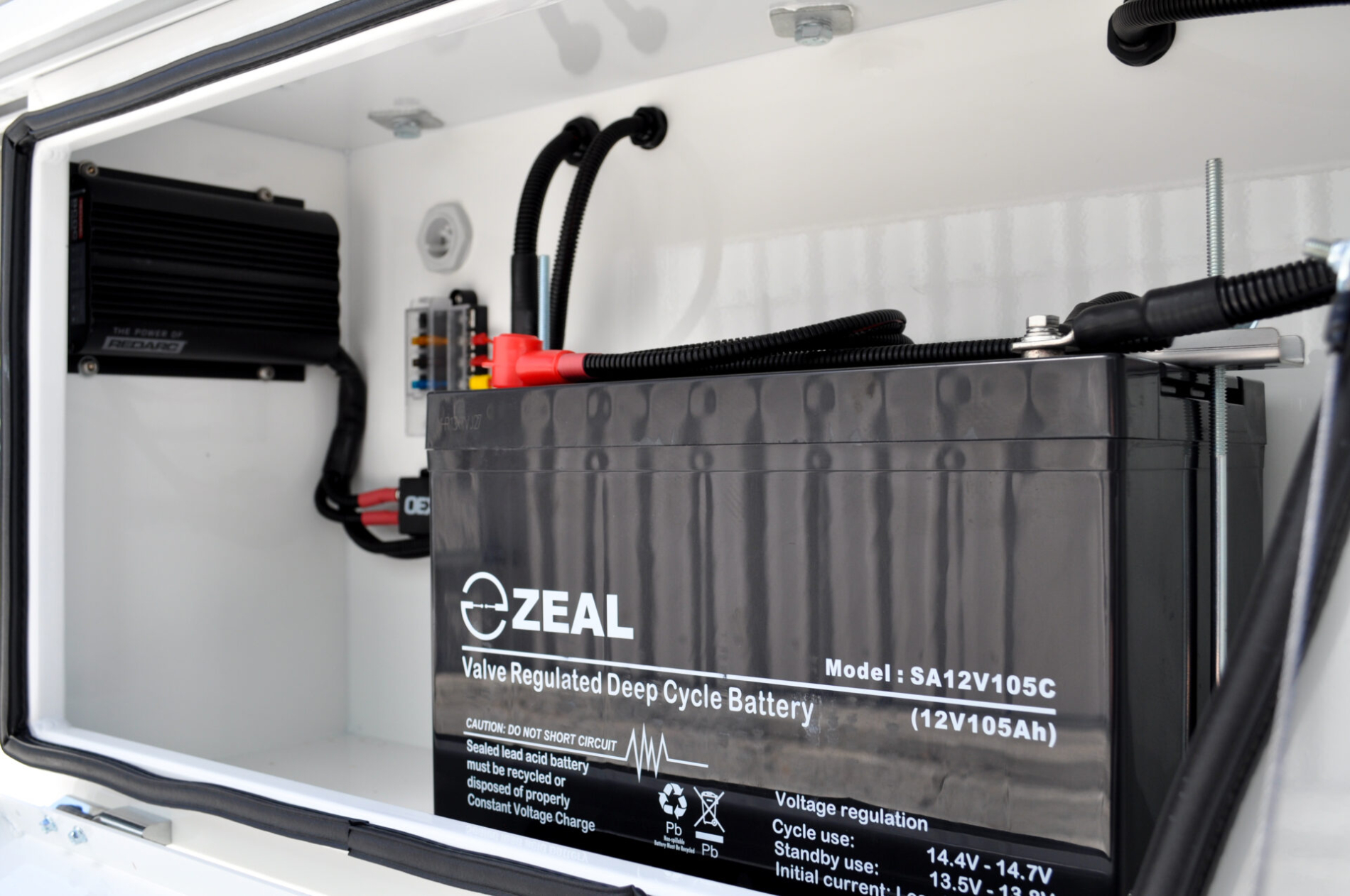 - Electrical package featuring dual battery system (100Ah AGM with Redarc 25A charger), E-Pac 2-door kit with central locking, LED internal lighting, and door alert buzzer system.