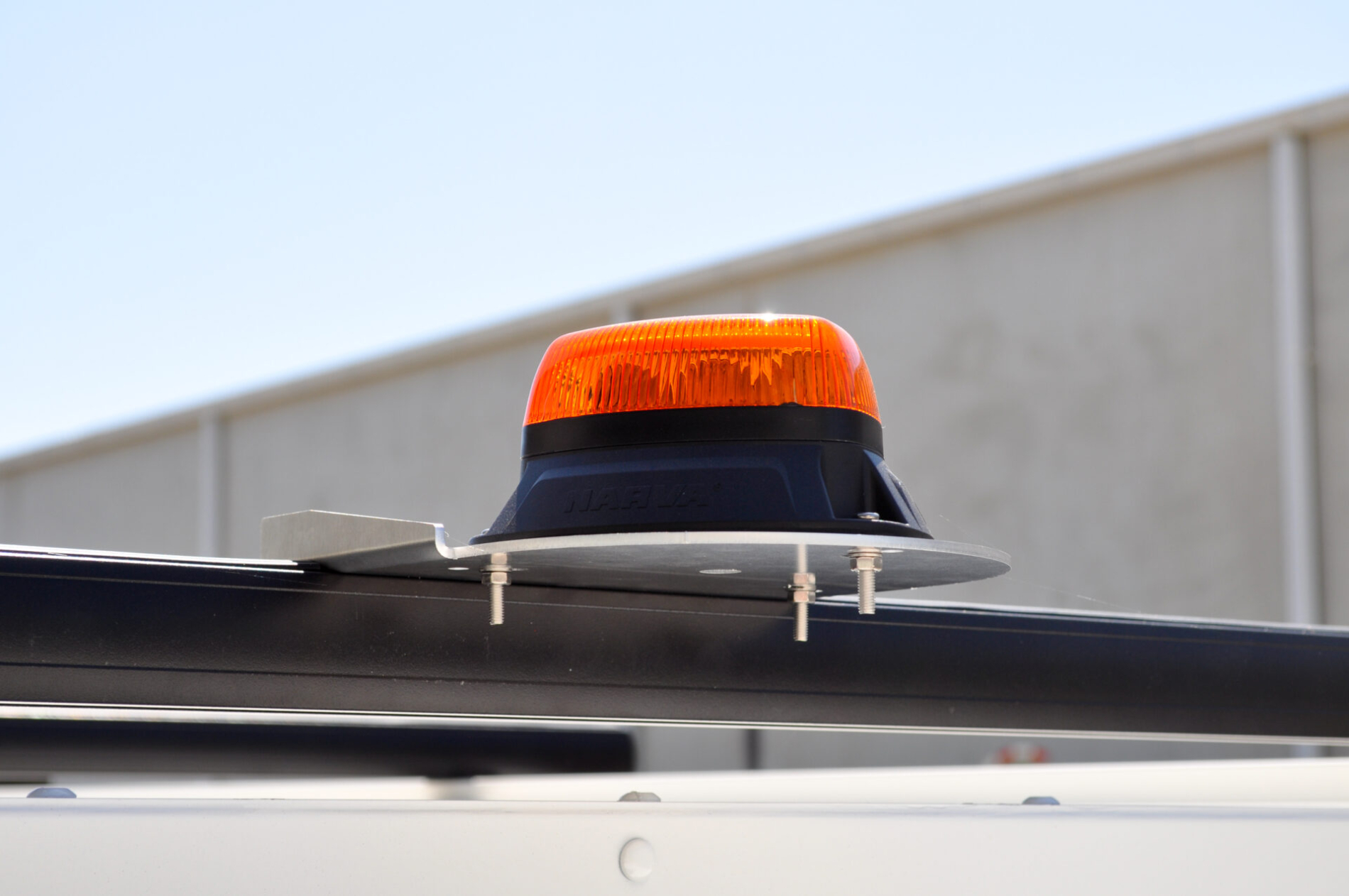 - Reverse safety systems including ultrasonic reverse sensors, high-definition rear vision mirror with constant rear-view camera feed, and Aerotech amber beacon mounted on a flat plate.