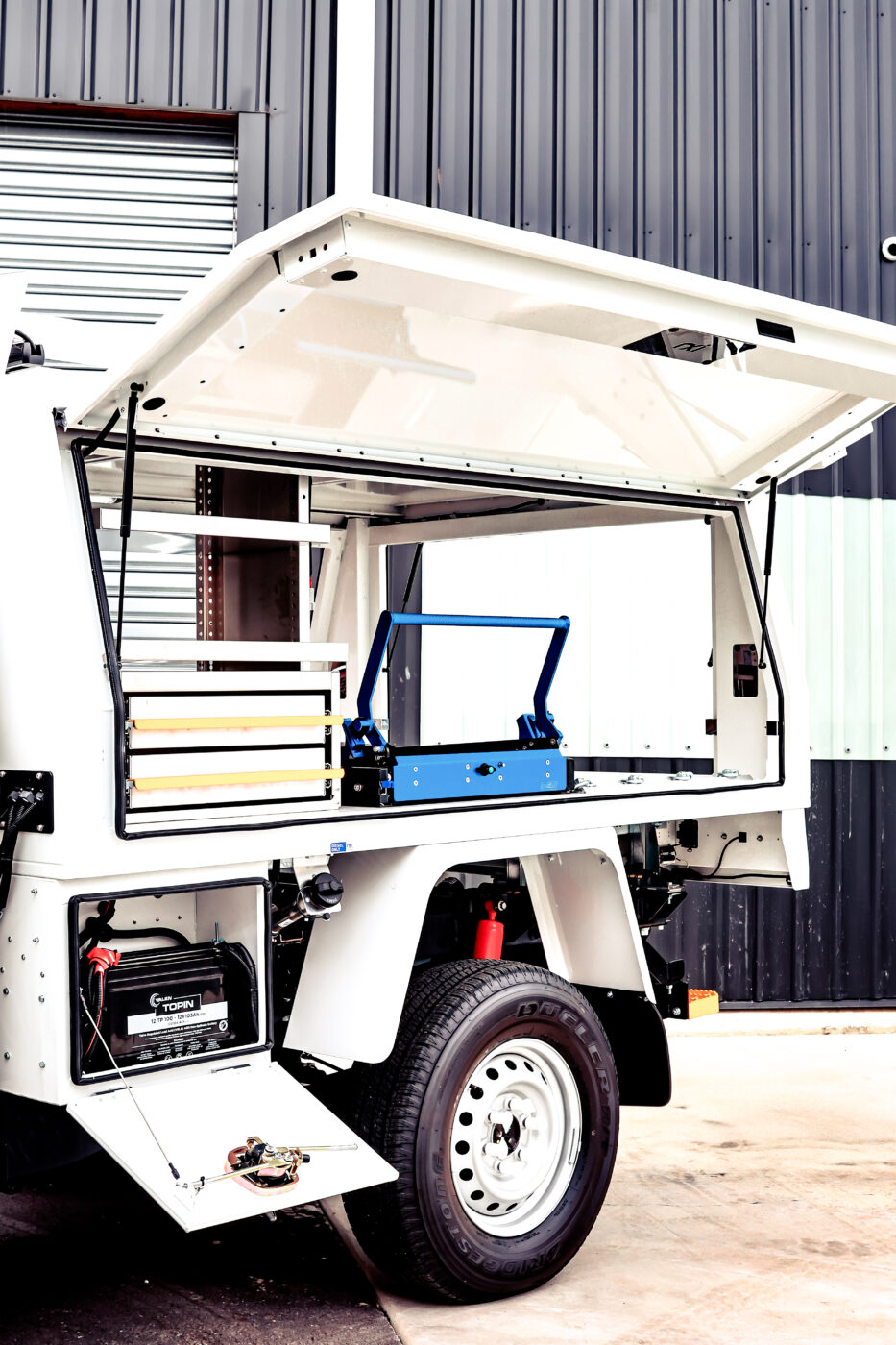 - Full aluminium Canopex Service Body (2400L x 1850W x 900H) with central locking to doors, shelving, drawers, and secure storage.