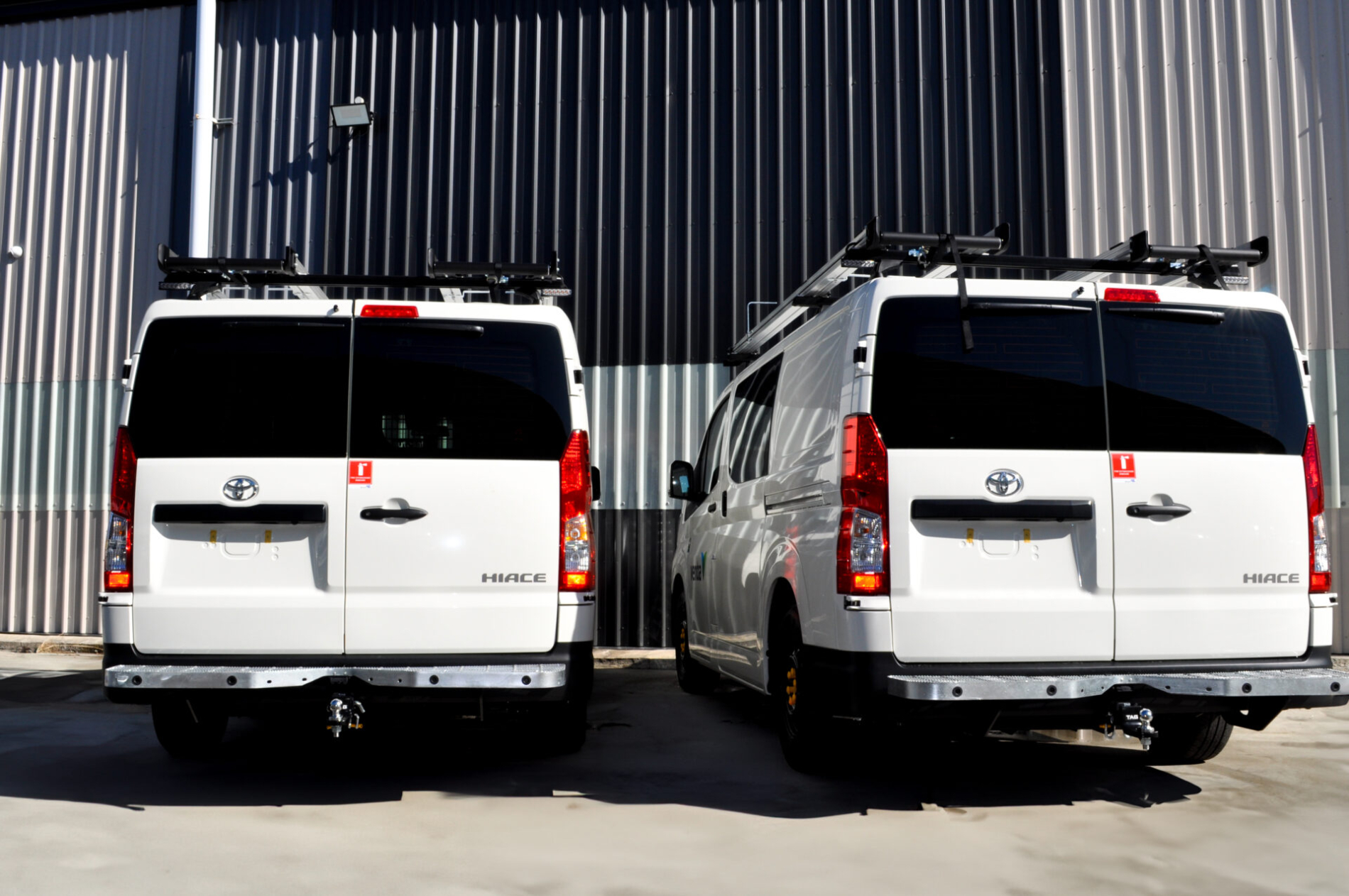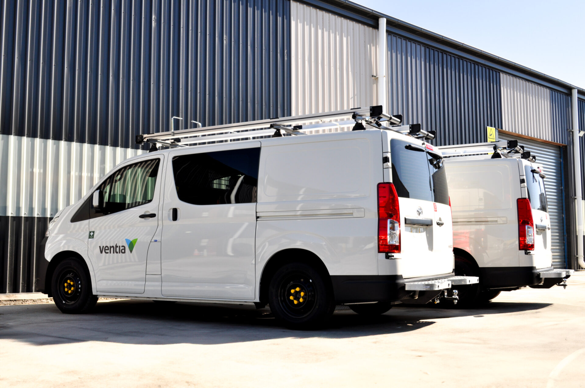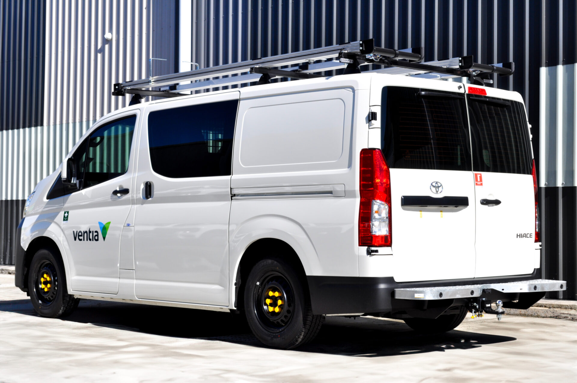 - Exterior utility enhancements included a heavy-duty 3-bar Rhino roof rack, two 3.0m ladder slides with rollers, a stainless-steel shovel tray, Telstra tow step with integrated heavy-duty towbar, and full decal kit for Ventia.