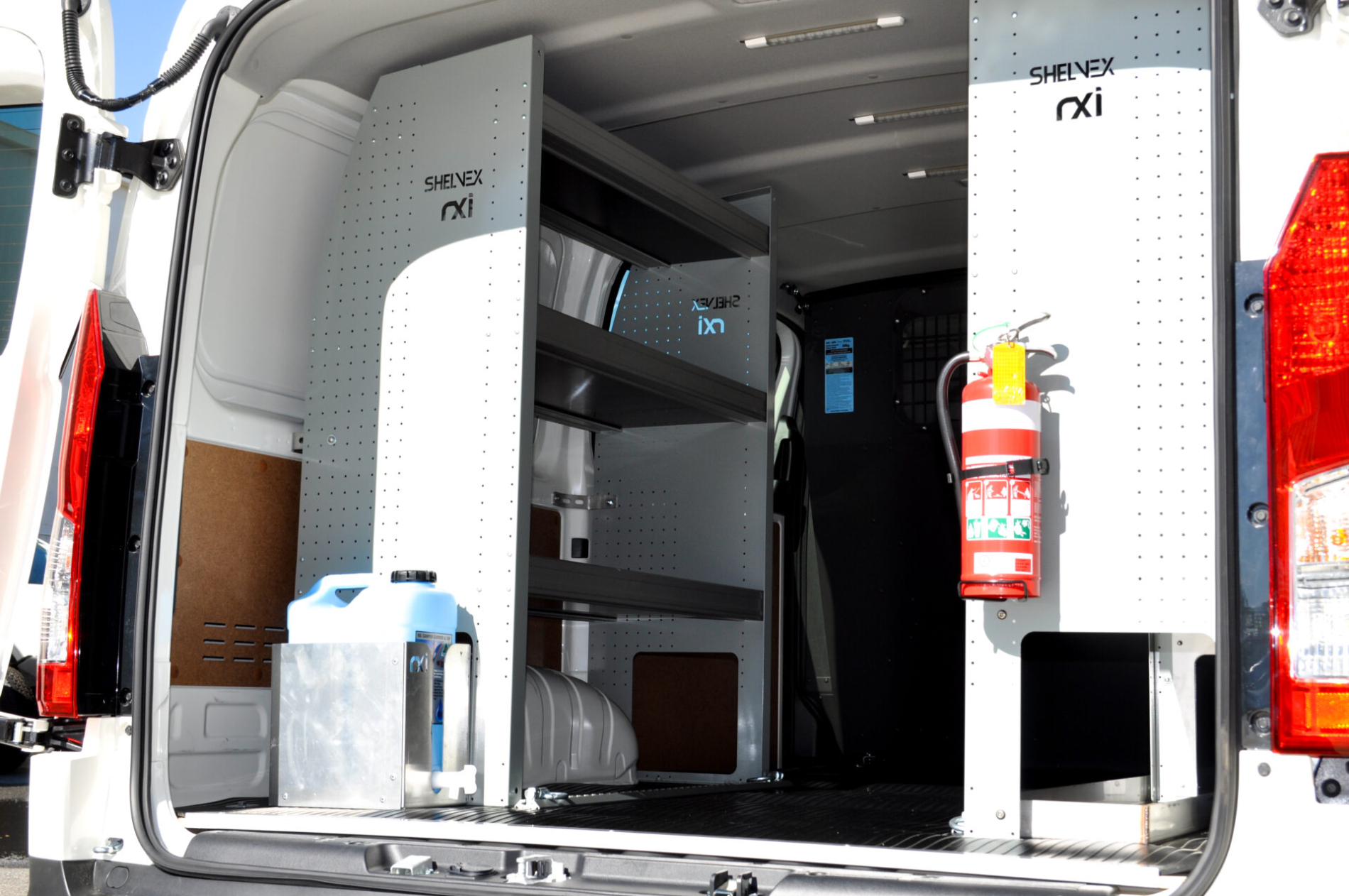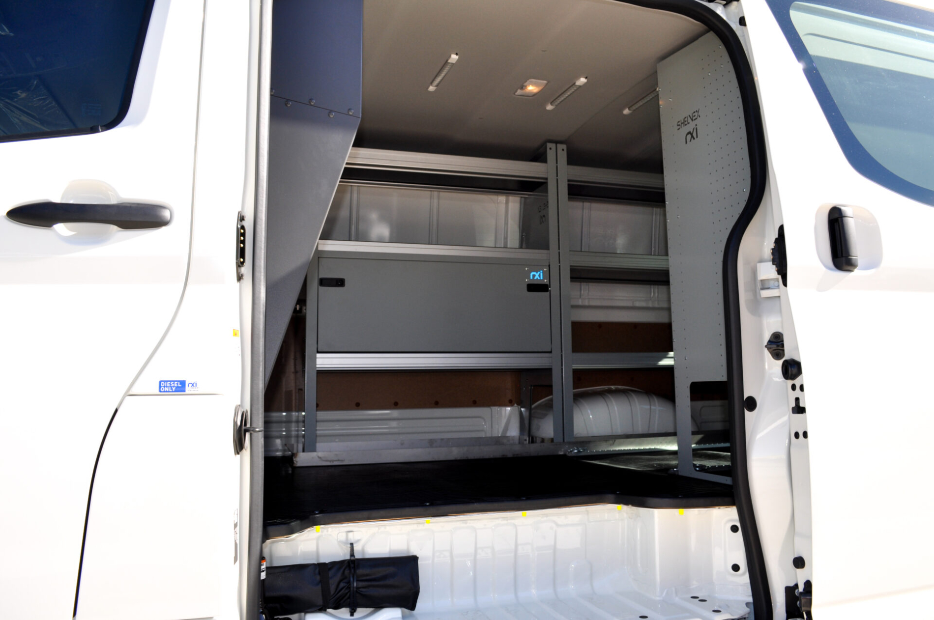 - The HiAce LWB was fitted with custom Shelvex shelving panels and bays, featuring 3-tier adjustable shelves, lockable units, and marine plywood and rubber flooring to organise tools and protect the cargo space.